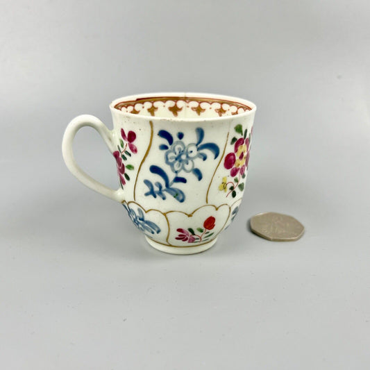 1st Period Worcester outside decorated coffee cup. Gilt trellis inner rim. c1770