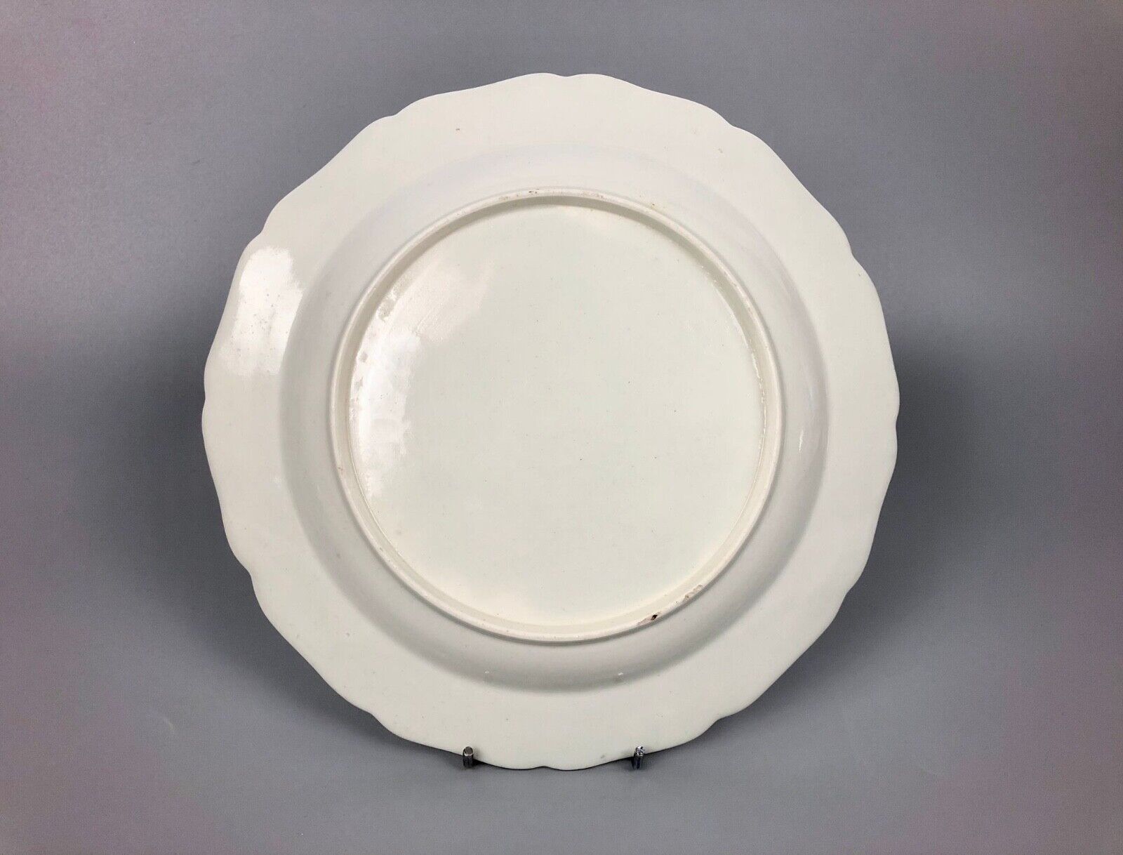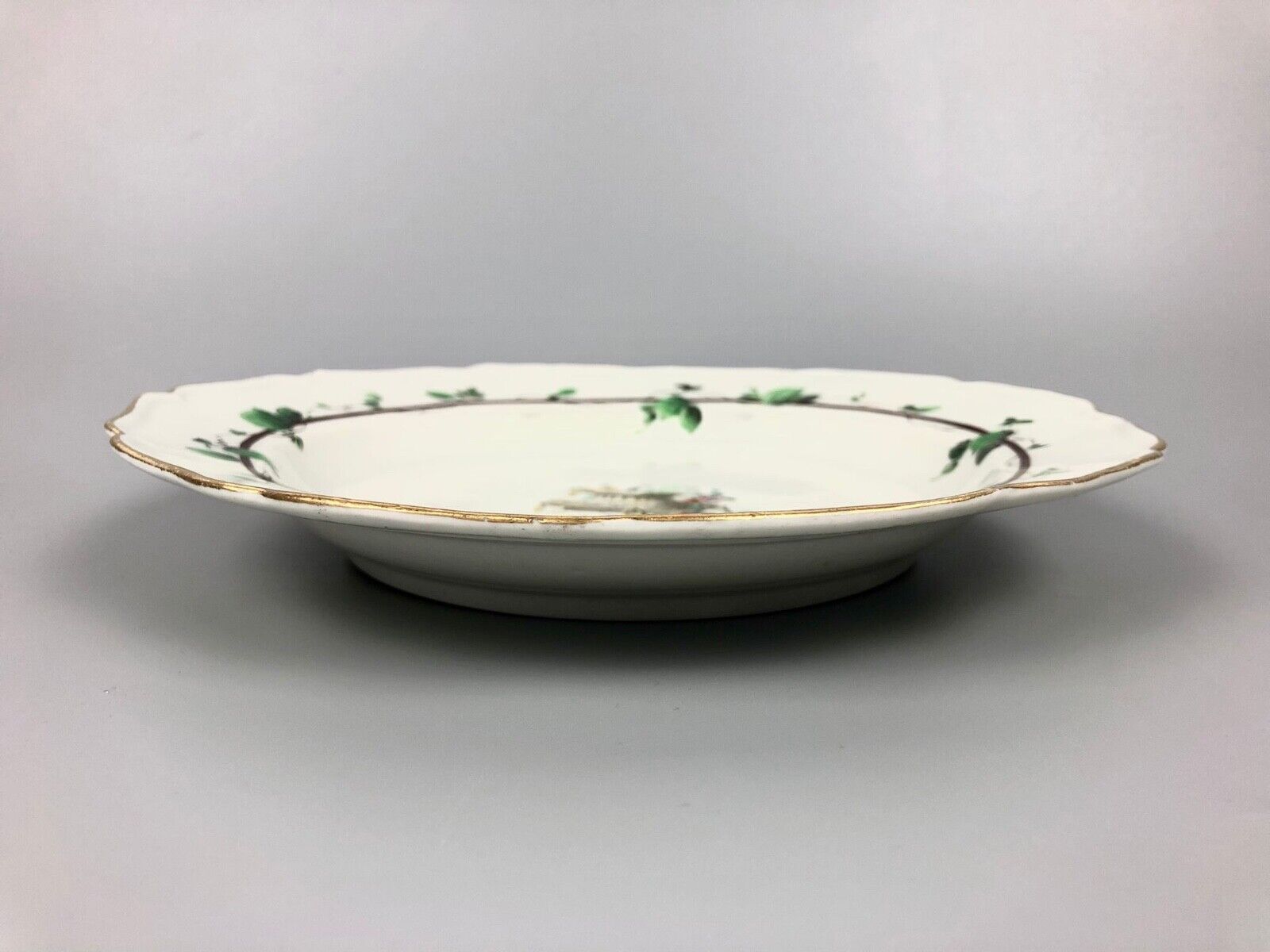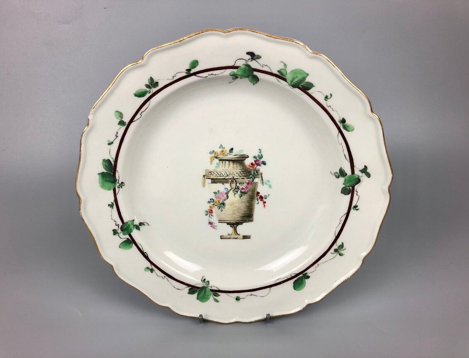 Painted, in the atelier of James Giles, with a floral-festooned urn. Border decoration of a brown line overlaid with foliage. Lobed and gilded rim.